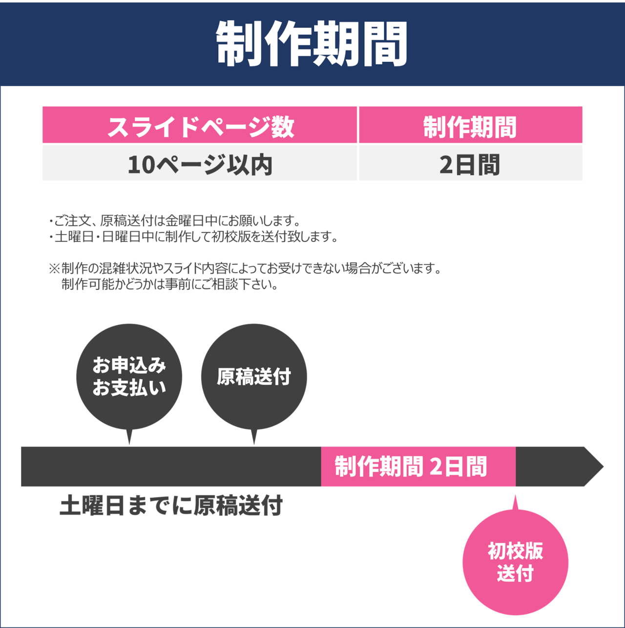本サービスはお客様作成の既存のプレゼン資料をブラッシュアップし、より魅力的な内容に仕上げます。金曜日中にご注文頂けましたら2日間でお届けするので、急なプレゼンテーションにも対応可能です。プロのデザイナーがあなたの要望に合わせて見やすく、効果的なデザインを提案します。